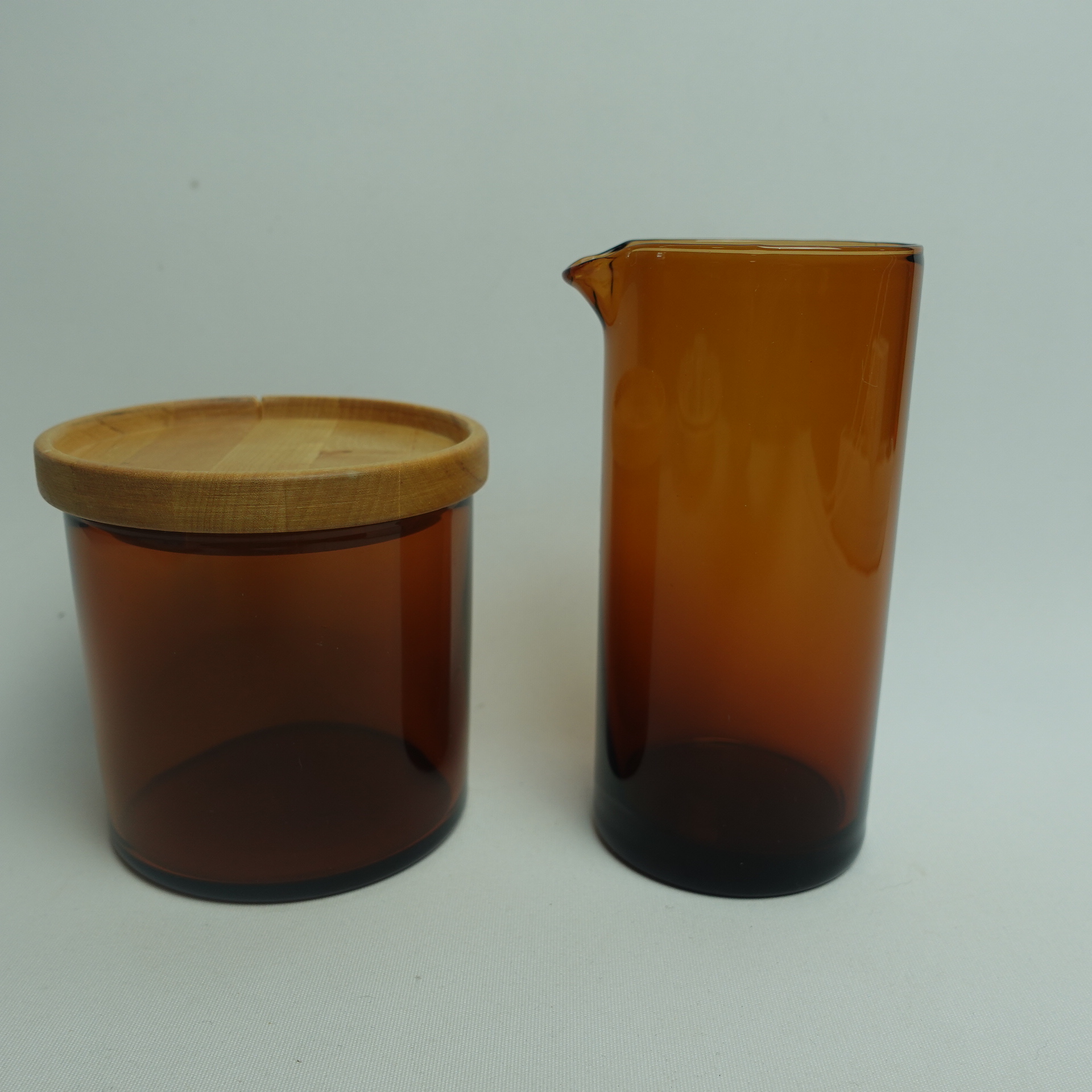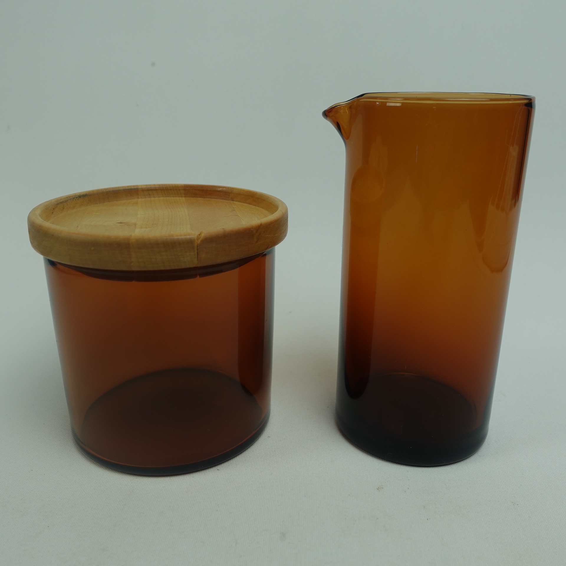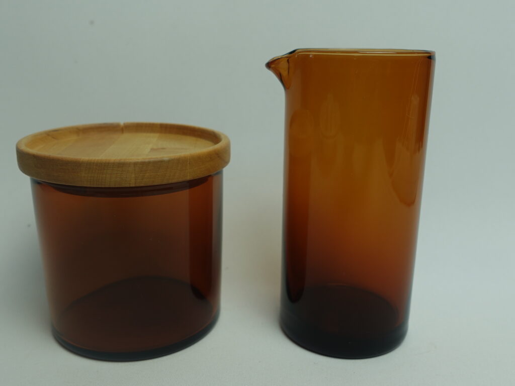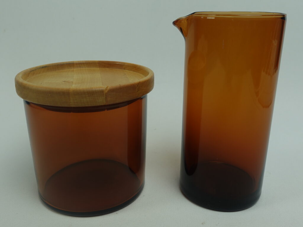 Kaj Franckin Nuutajärven lasille suunnitteleman Purtilo-sarjan ruskea kannellinen sokerikko ja kermakko. Sarja oli tuotannossa v.1975-80. Kermakon korkeus on 12 cm, halkaisija 5,5 cm ja tilavuus 25 cl. Sokerikon korkeus ilman kantta on 7,3 cm, halkaisija 7,8 cm ja tilavuus 25 cl. Myynnissä olevat sokerikko ja kermakko ovat ehjiä ja muutenkin hyväkuntoisia. Puukannessa on pieni lohkeama kts. kuva. Sokerikko ja kermakko myydään erillisinä tuotteina.