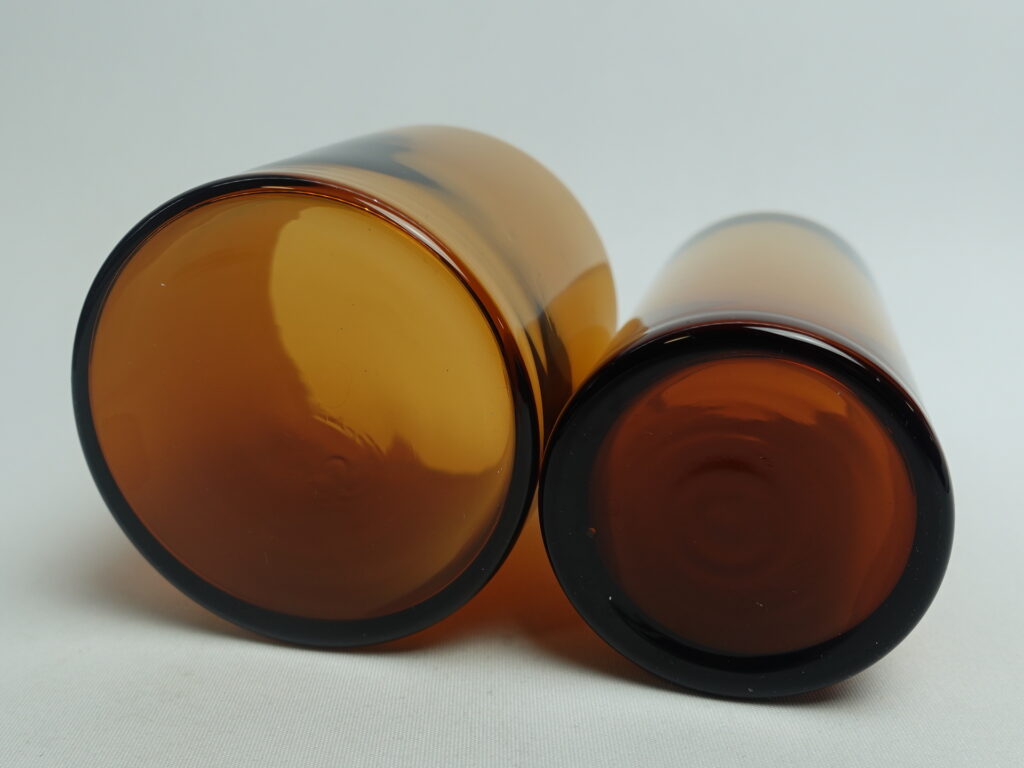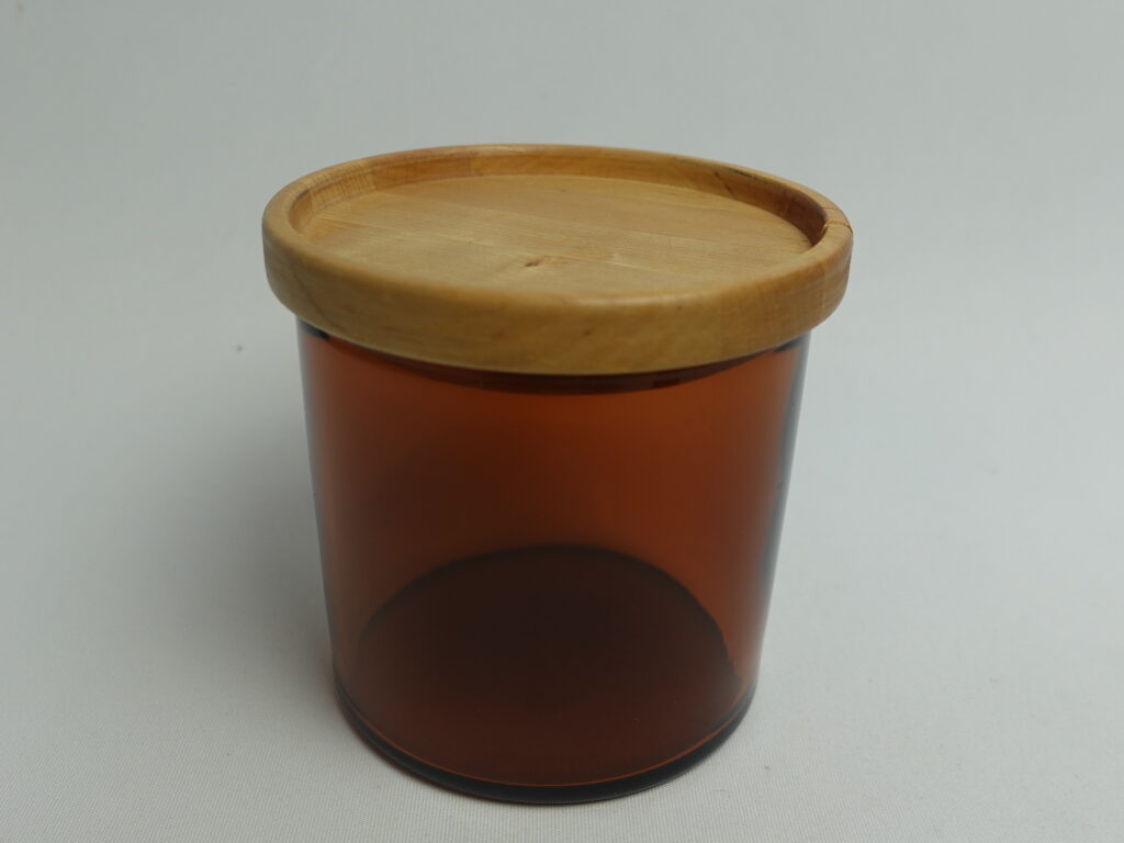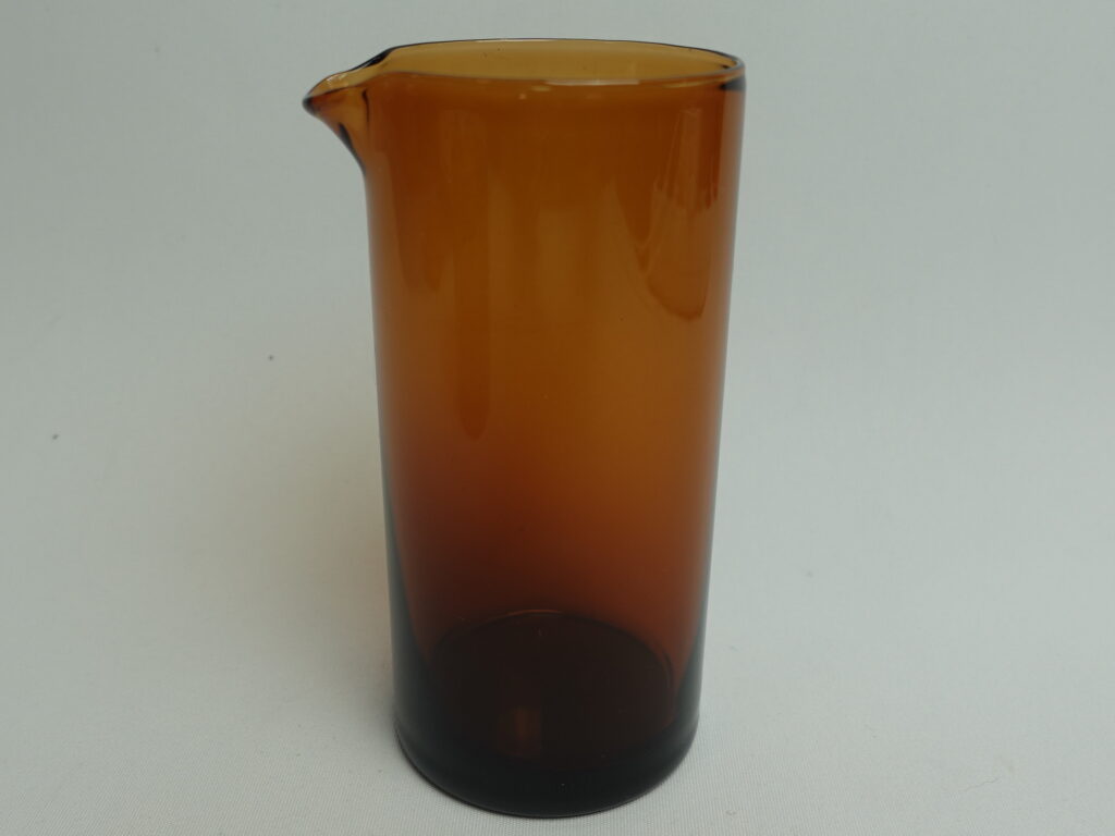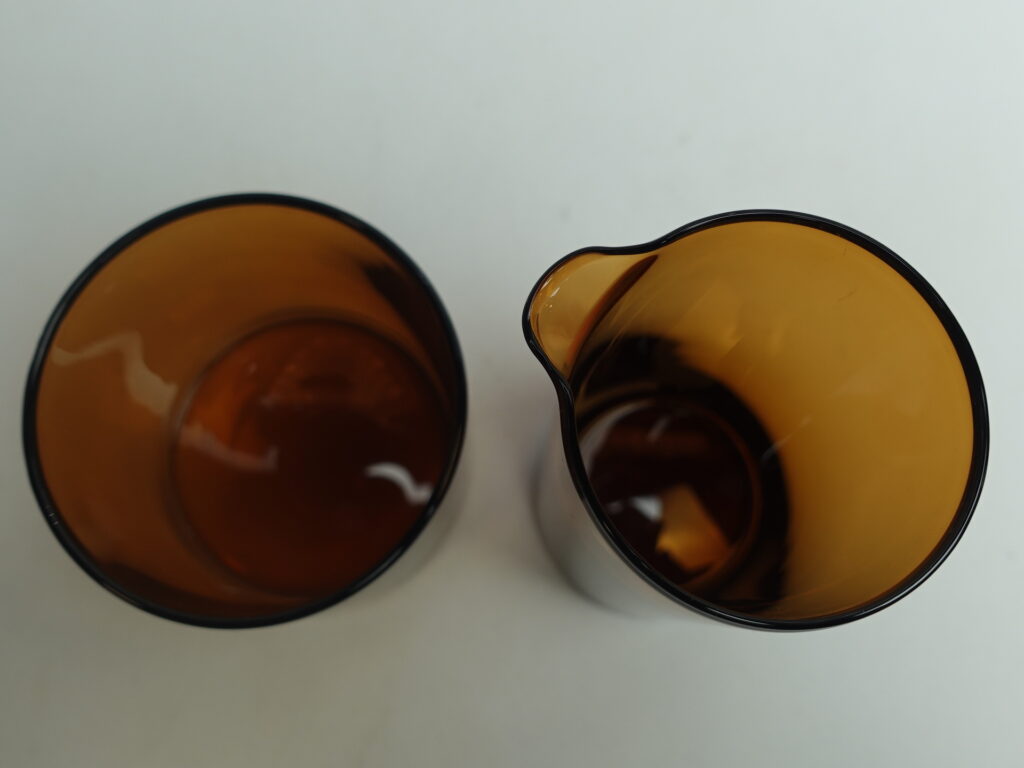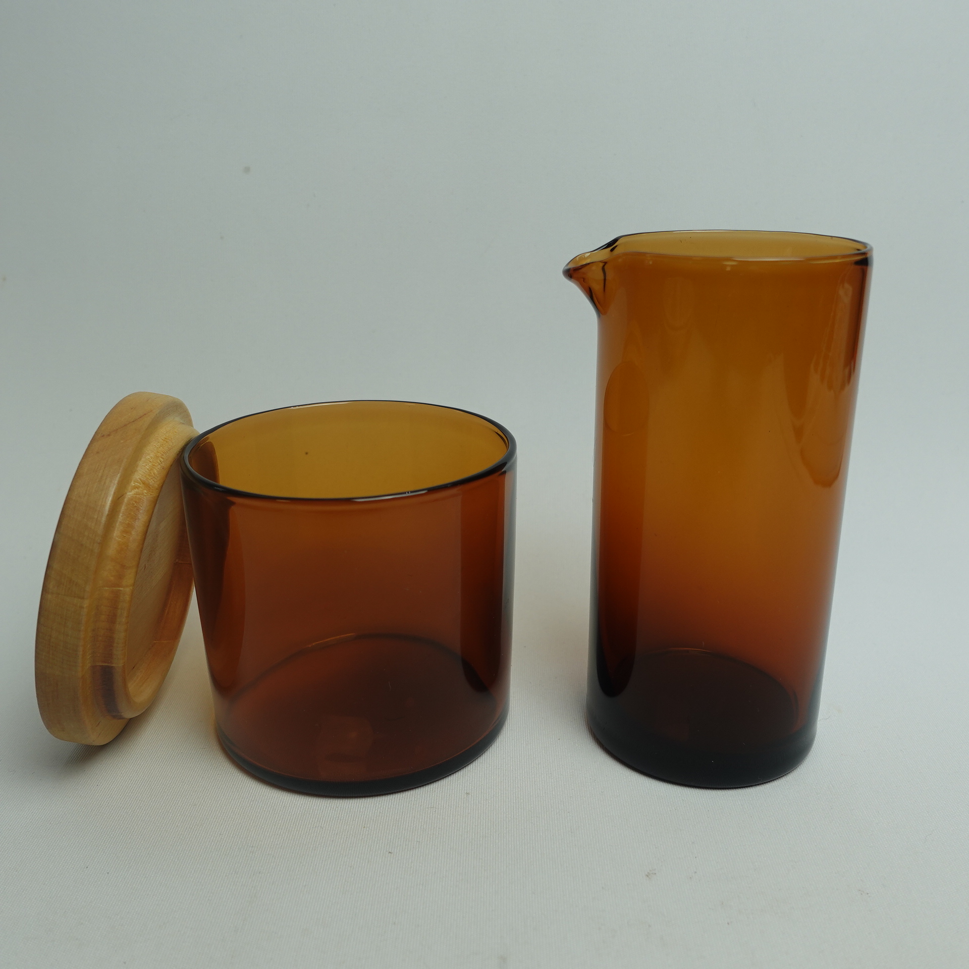 Kaj Franckin Nuutajärven lasille suunnitteleman Purtilo-sarjan ruskea kannellinen sokerikko ja kermakko. Sarja oli tuotannossa v.1975-80. Kermakon korkeus on 12 cm, halkaisija 5,5 cm ja tilavuus 25 cl. Sokerikon korkeus ilman kantta on 7,3 cm, halkaisija 7,8 cm ja tilavuus 25 cl. Myynnissä olevat sokerikko ja kermakko ovat ehjiä ja muutenkin hyväkuntoisia. Puukannessa on pieni lohkeama kts. kuva. Sokerikko ja kermakko myydään erillisinä tuotteina.