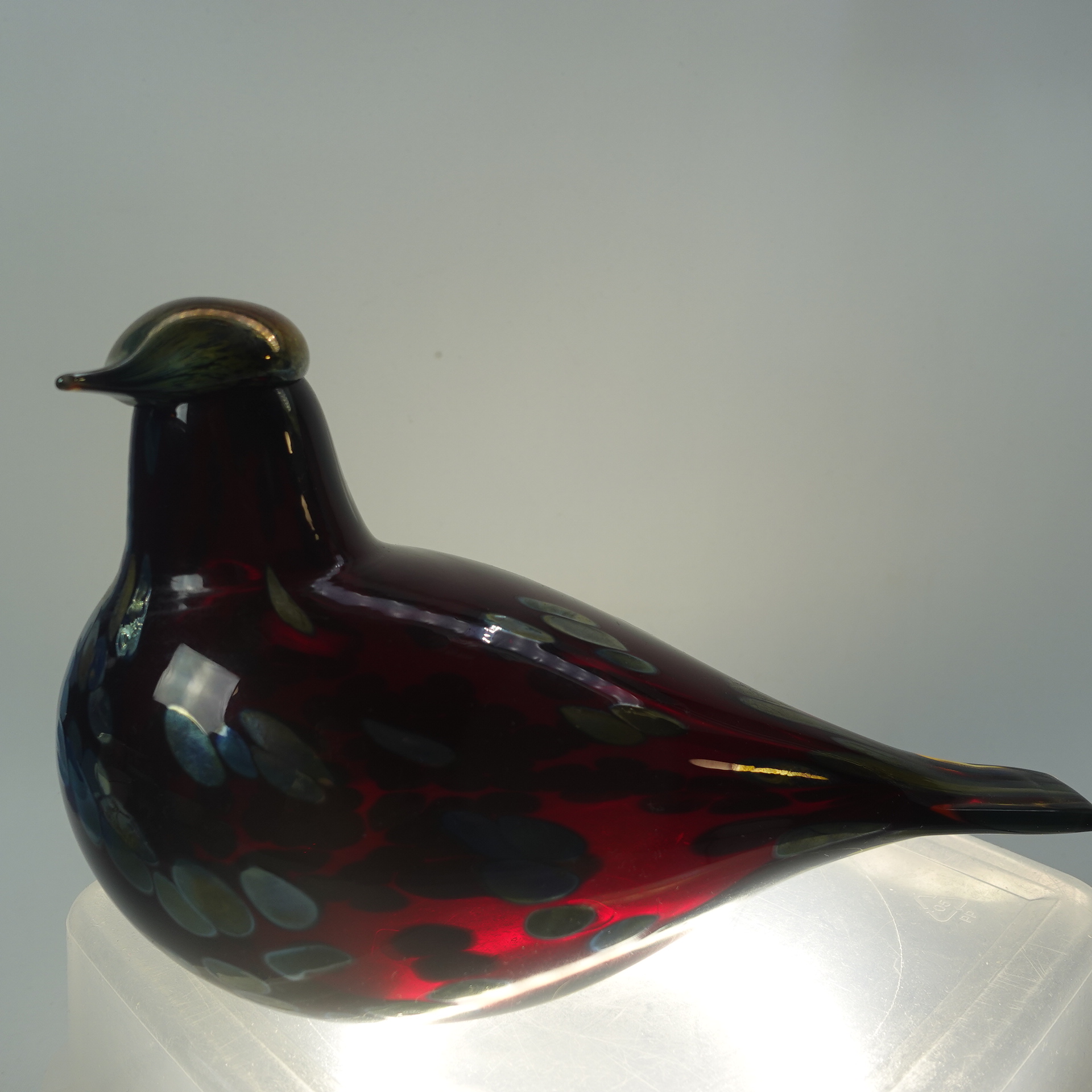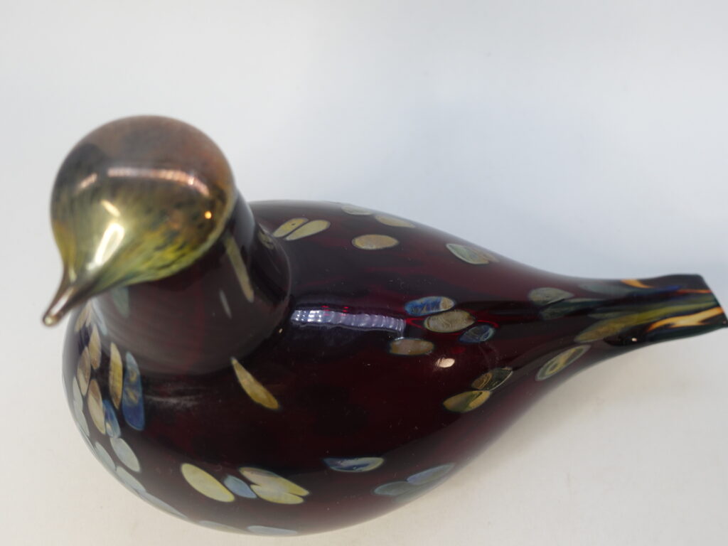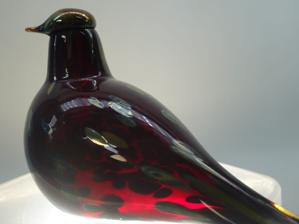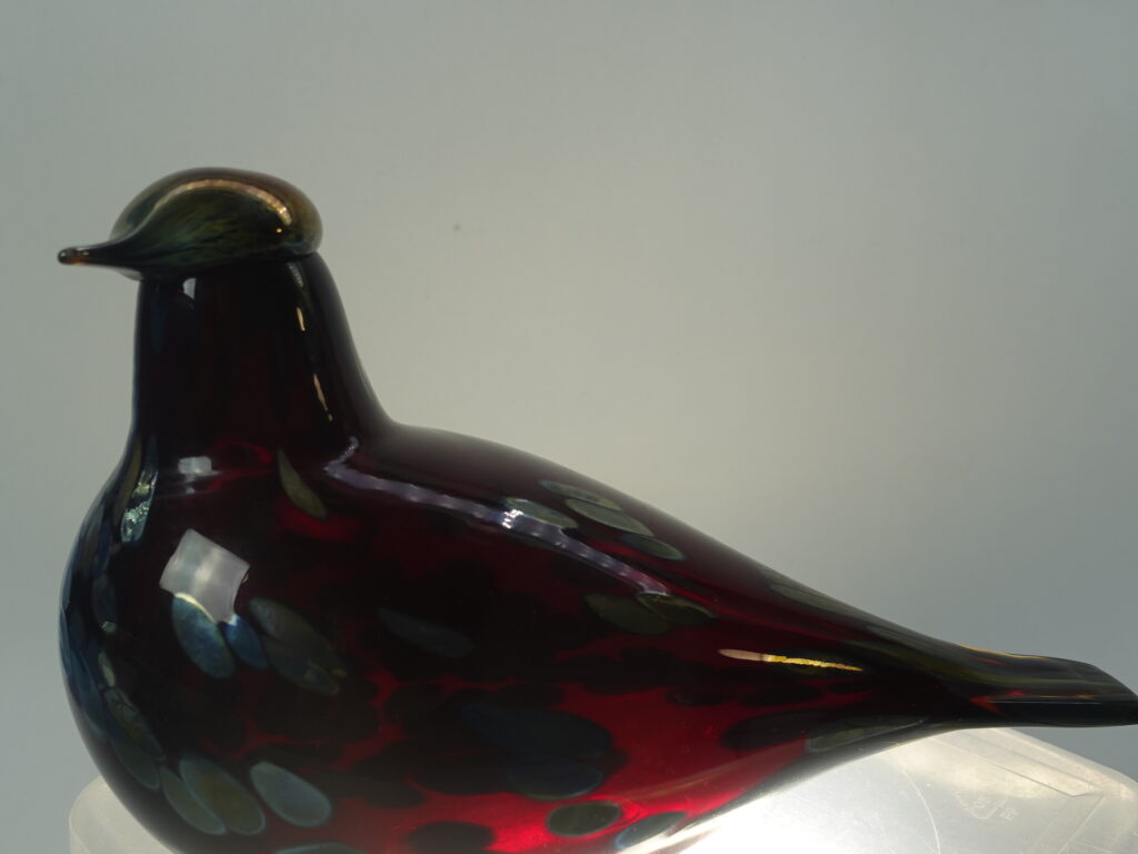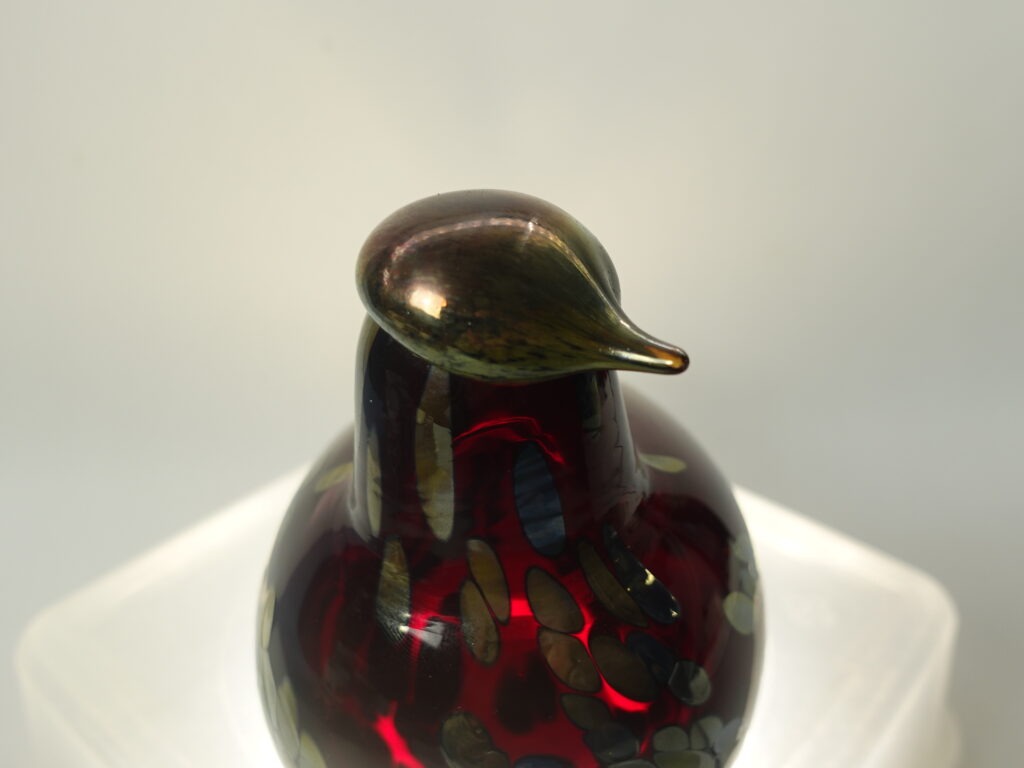 Oiva Toikan Nuutajärven lasille suunnittelema punainen Rubiinilintu. Taidelasilintu oli tuotannossa v. 1996-2014. Linnun korkeus on n. 13,5 cm ja pituus 21 cm. Lintu on signeerattu O. Toikka Nuutajärvi. Linnussa on myös Iittalan 90-luvulla käyttämä i-tarra. Myynnissä oleva lintu on ehjä ja naarmuton.