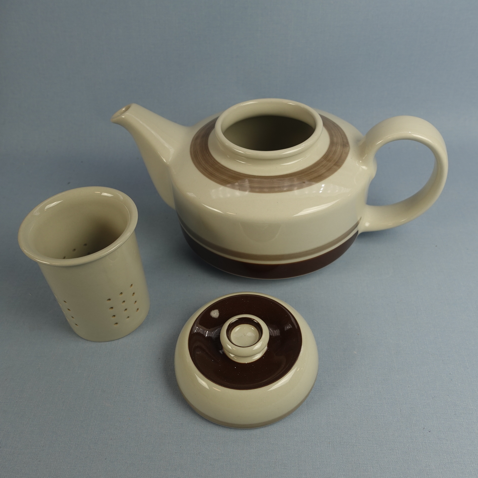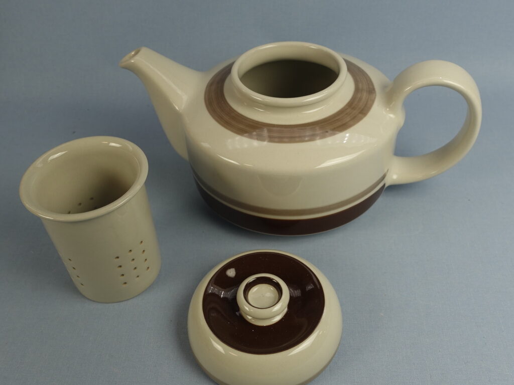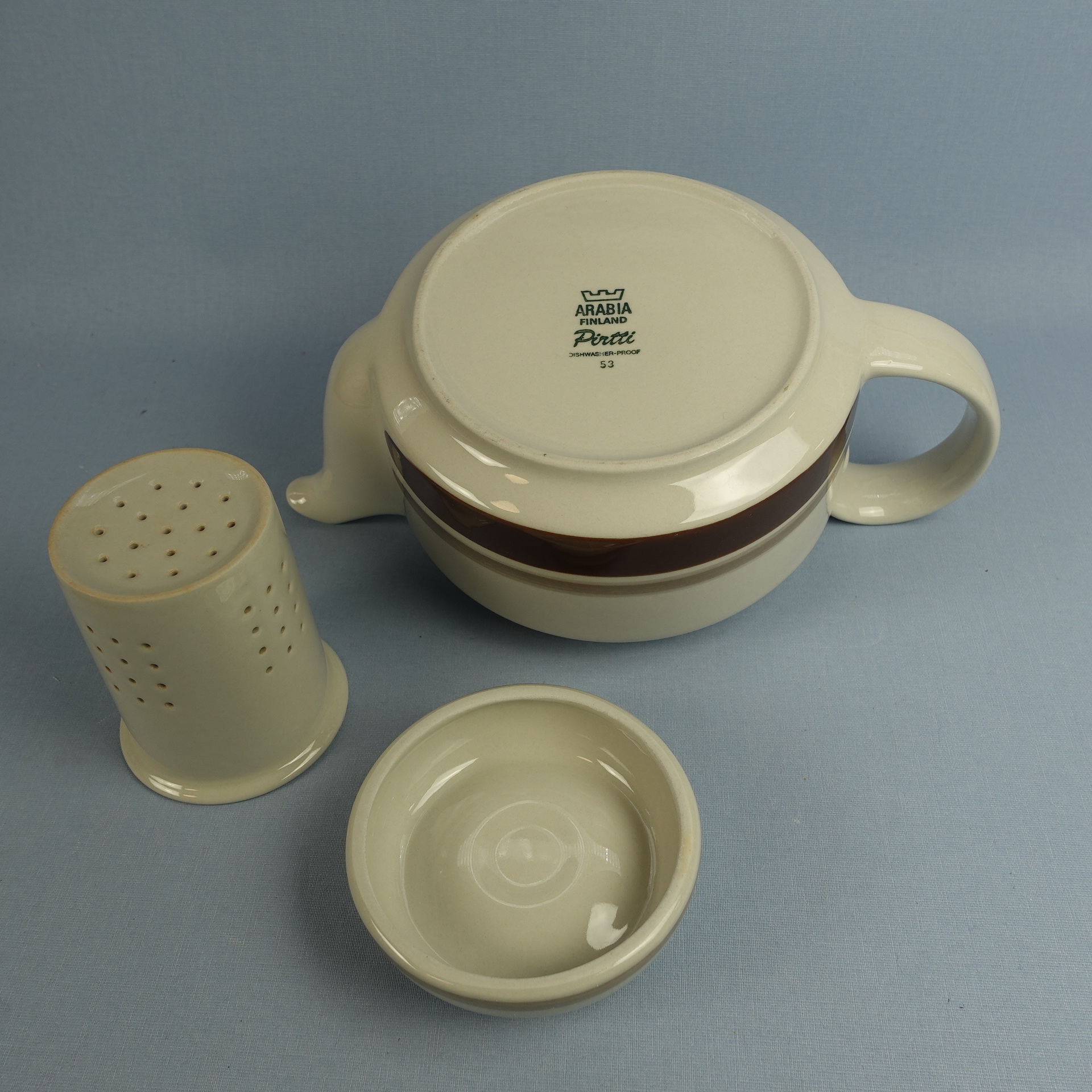 Raija Uosikkisen Arabialle suunnitteleman Pirtti-sarjan teekannu sihdillä. Koriste oli tuotannossa Anja Jaatinen-Winquistin suunnittelemissa M-mallin astioissa v. 1969-85. Kannun korkeus on kannen kanssa n. 14 cm ja tilavuus 1,3 litraa. Myynnissä oleva teekannu on ehjä ja muutenkin hyväkuntoinen.