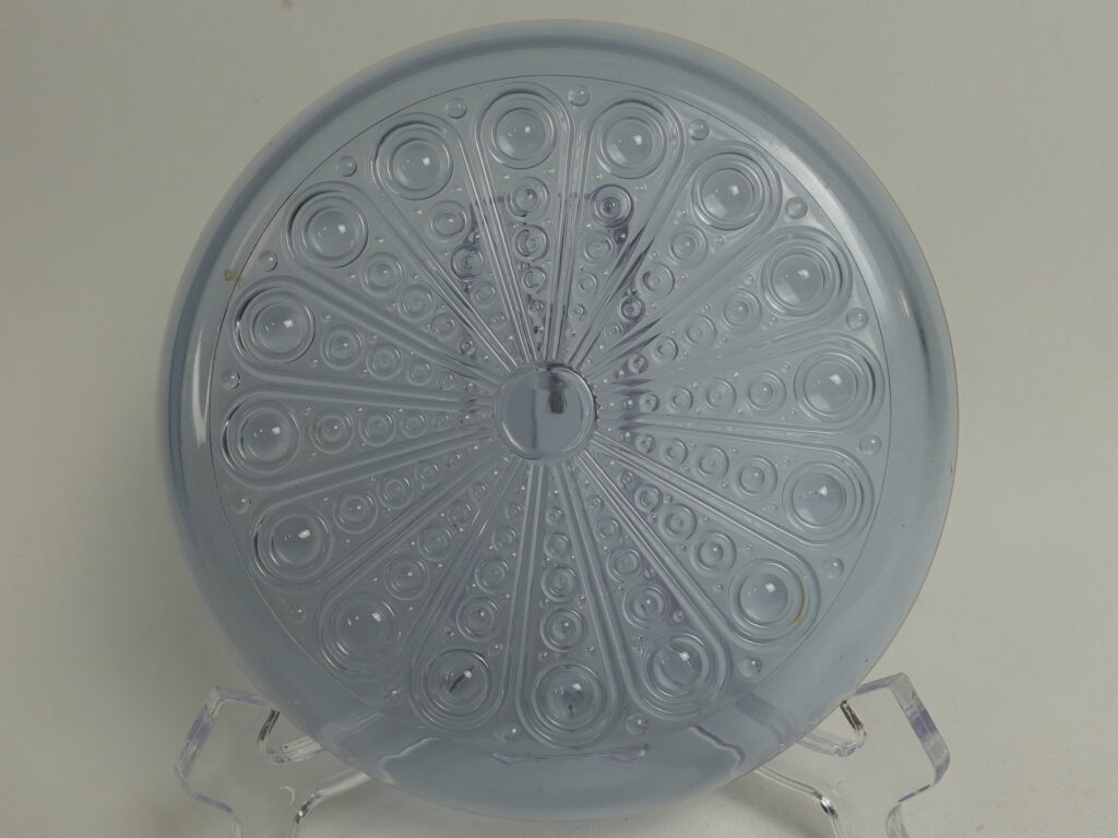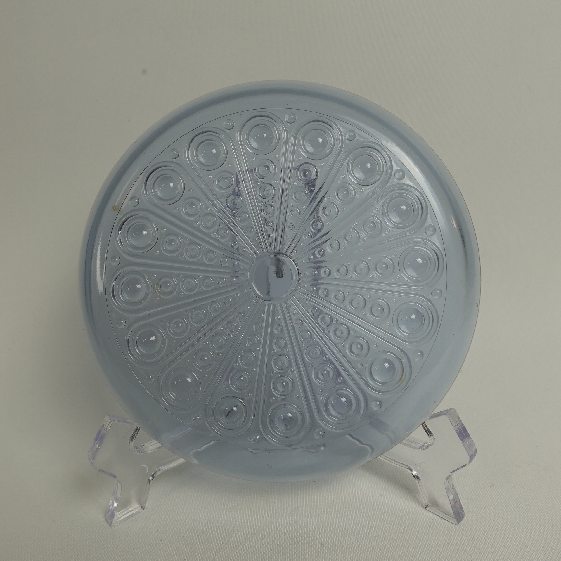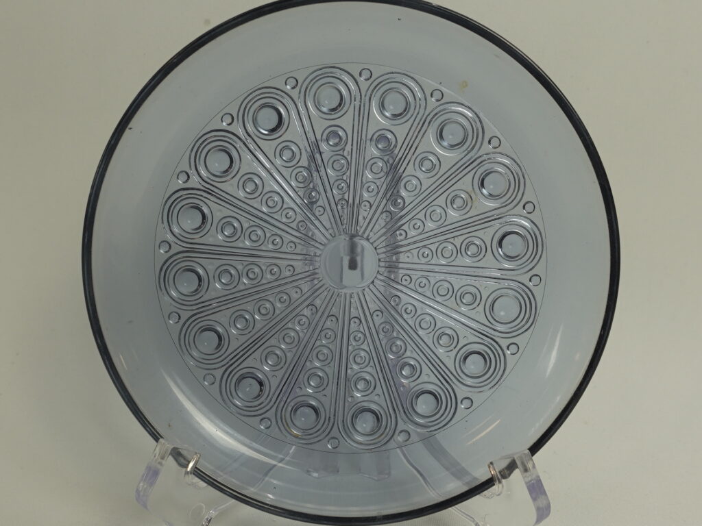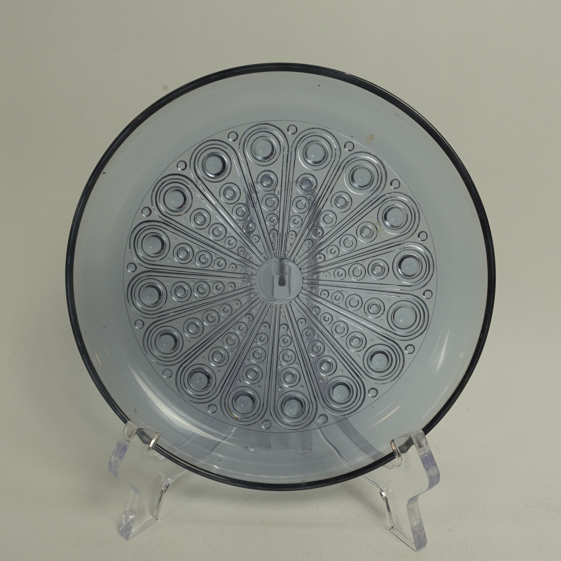 Nanny Stillin Riihimäen lasille suunnittelema neodymin värinen Riikinkukko-sarjan lautanen. Sarja oli tuotannossa v. 1969-71 ja sitä valmistettiin useassa eri värissä. Lautasen halkaisija on 145 mm. Myynnissä olevat lautaset ovat ehjiä ja muutenkin hyväkuntoisia.
