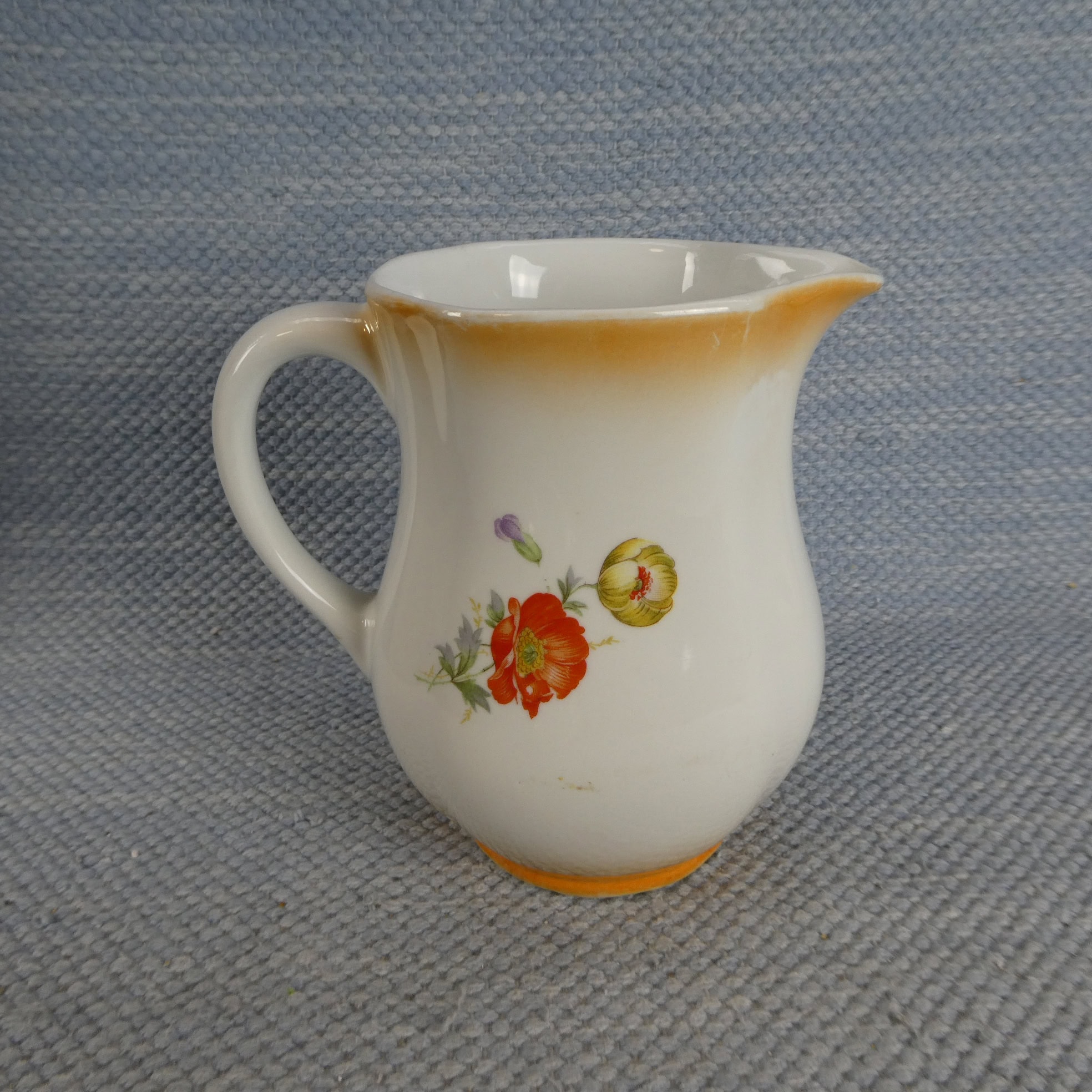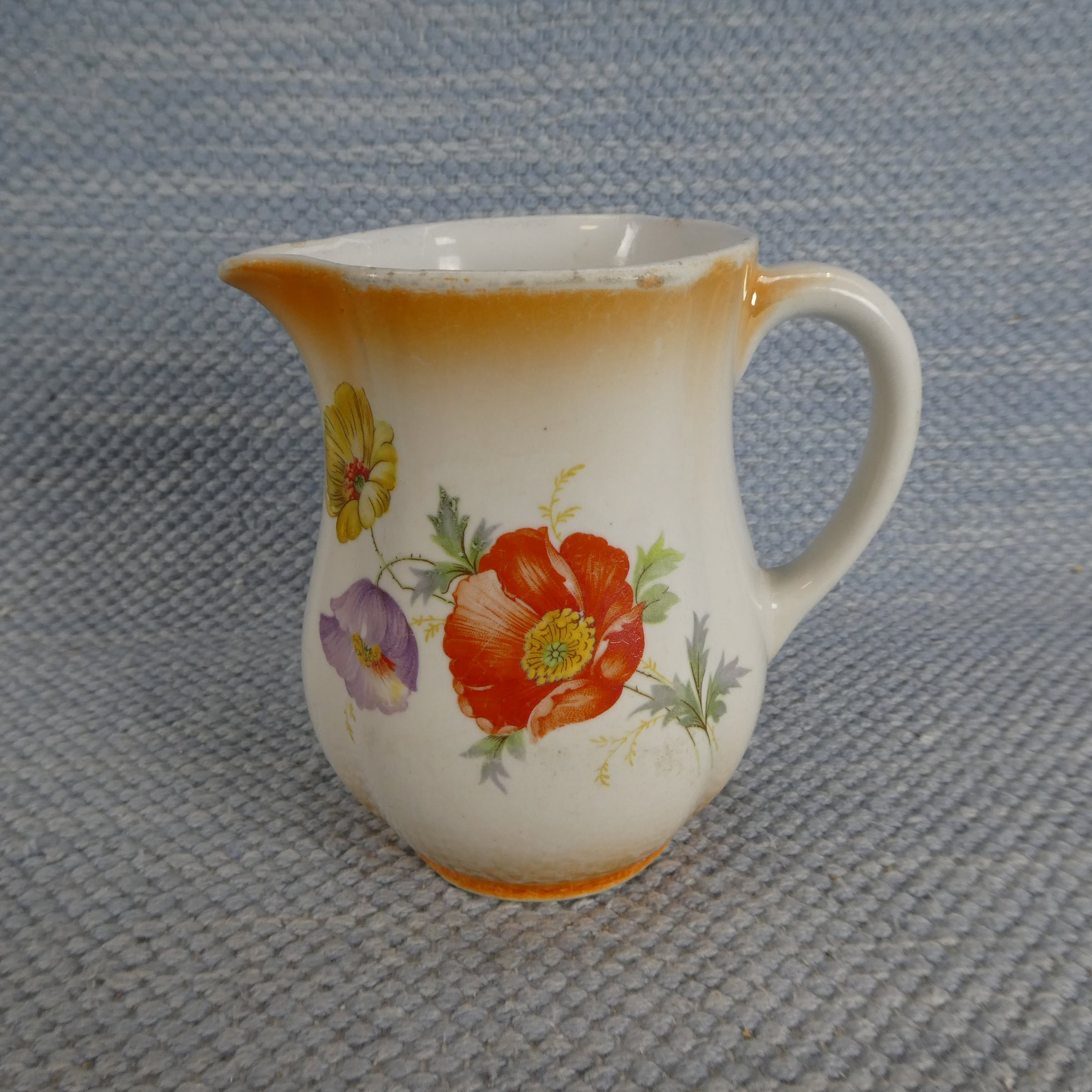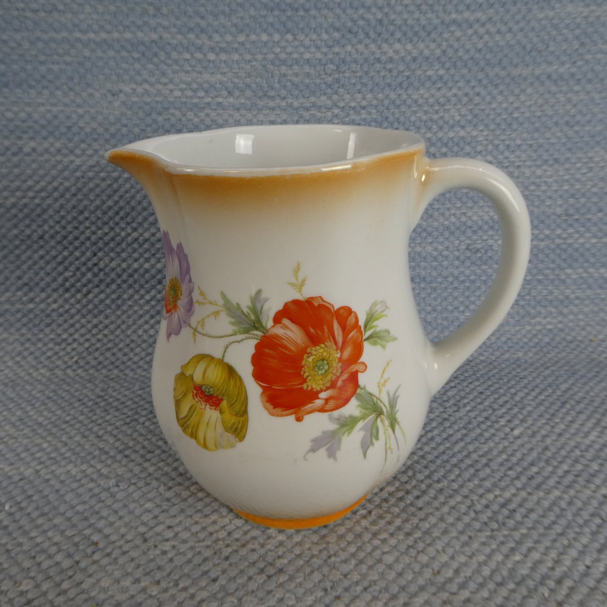 Arabia milk jug, lustre rim, IO model. Three differently colored flowers. The jugs’ sizes are 0.5 and 1 liter. The jugs are intact and otherwise in good condition, with minimal wear.