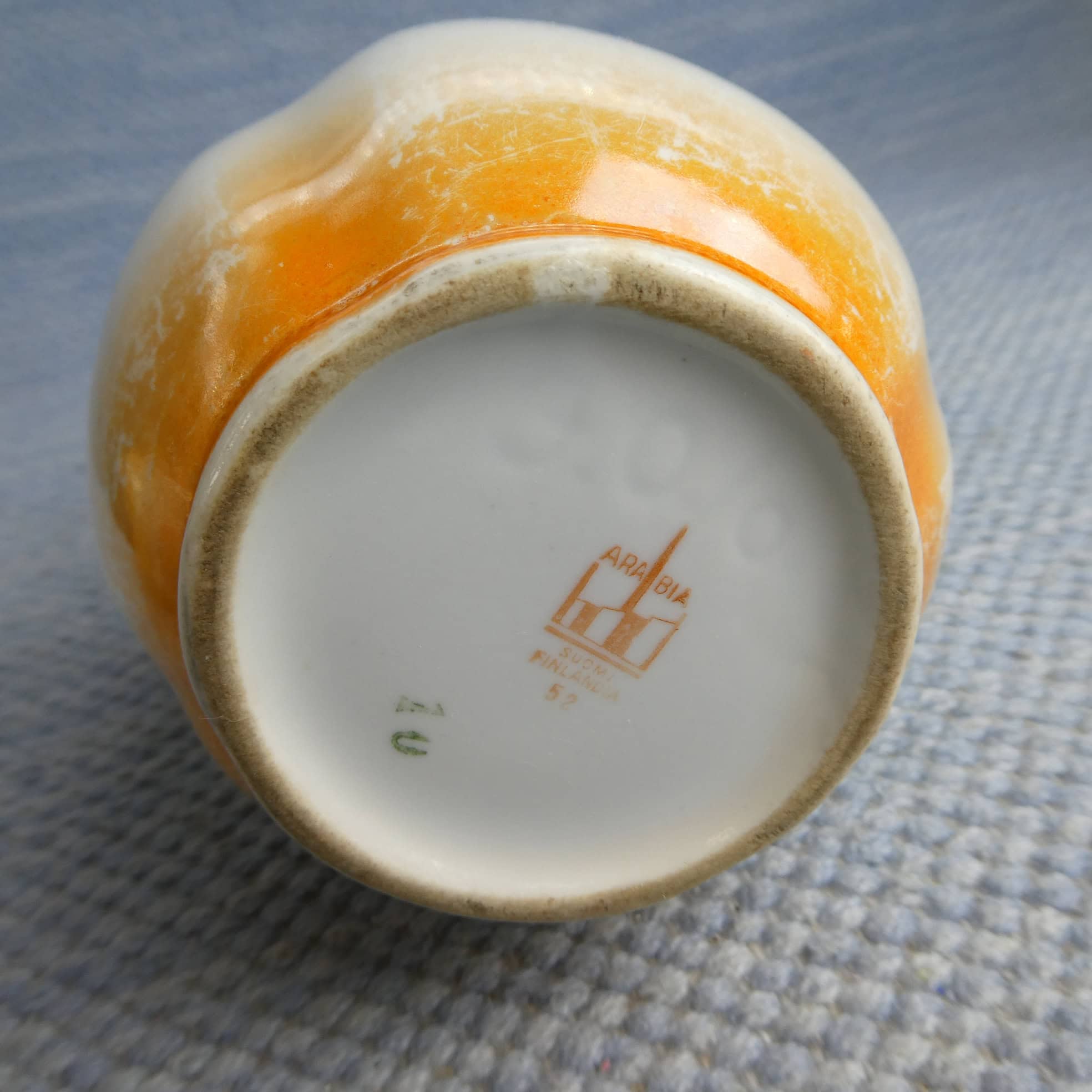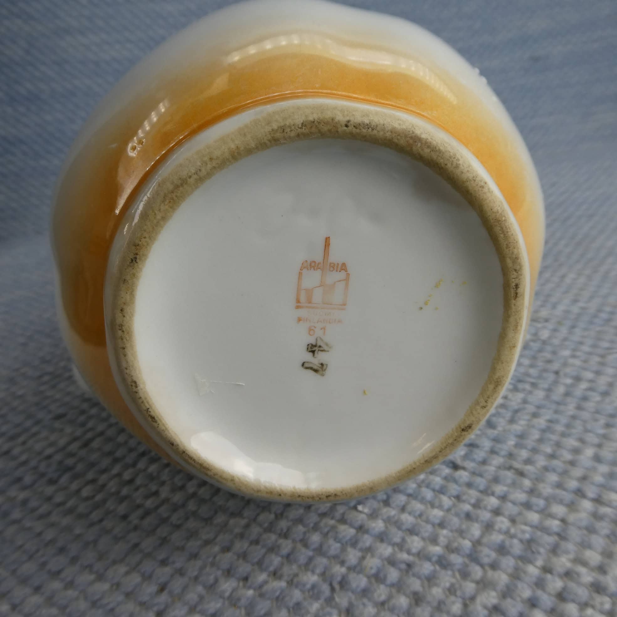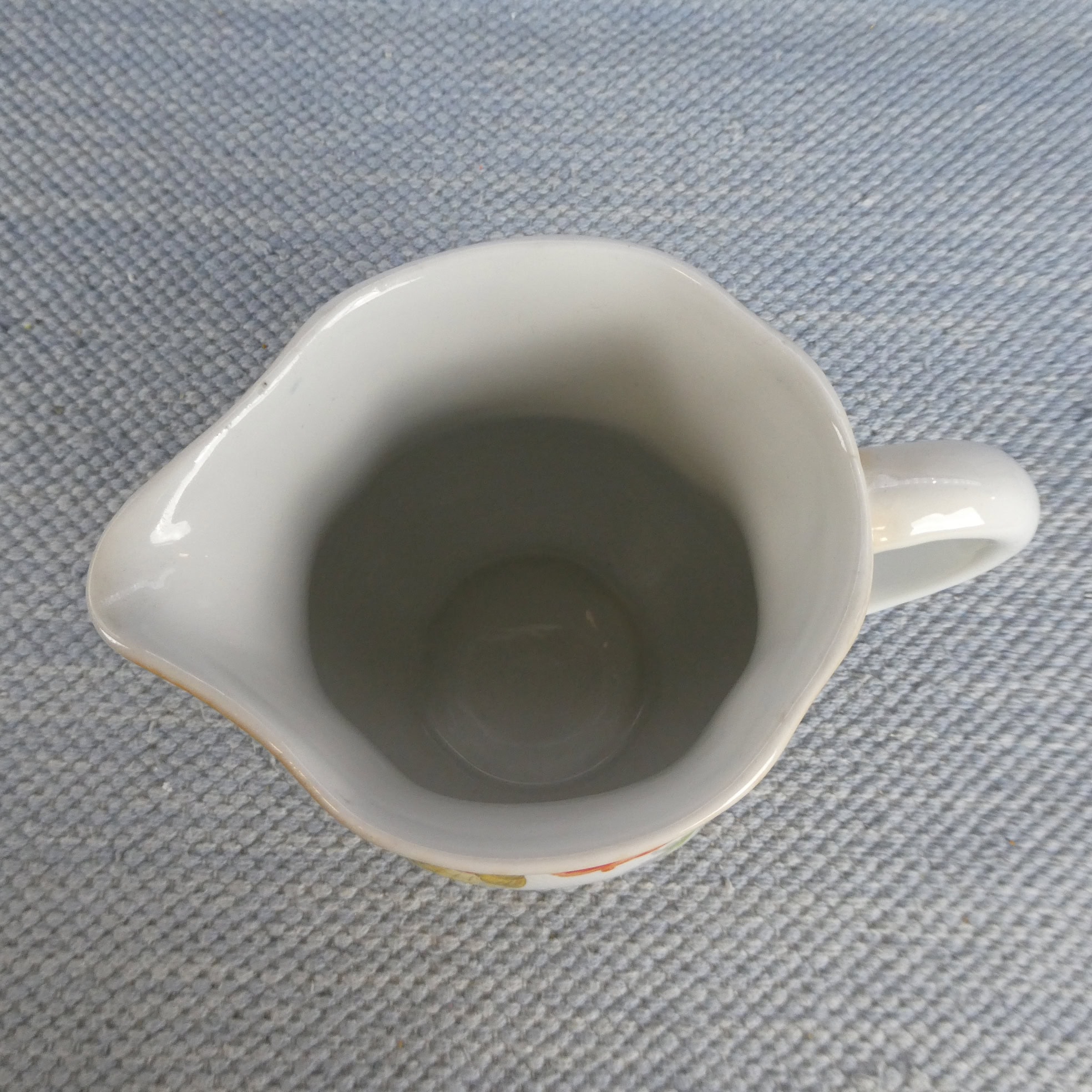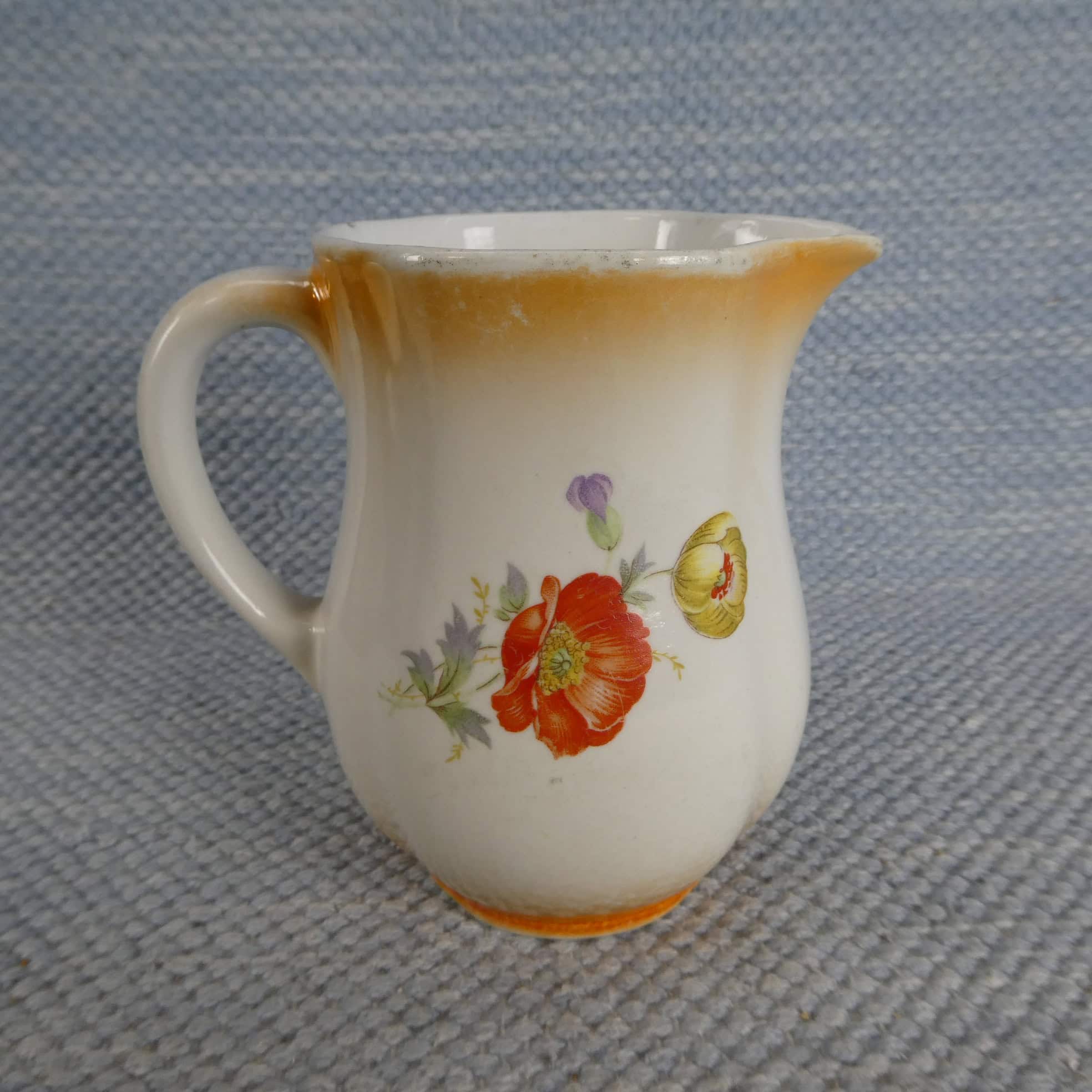 Arabia milk jug, lustre rim, IO model. Three differently colored flowers. The jugs’ sizes are 0.5 and 1 liter. The jugs are intact and otherwise in good condition, with minimal wear.