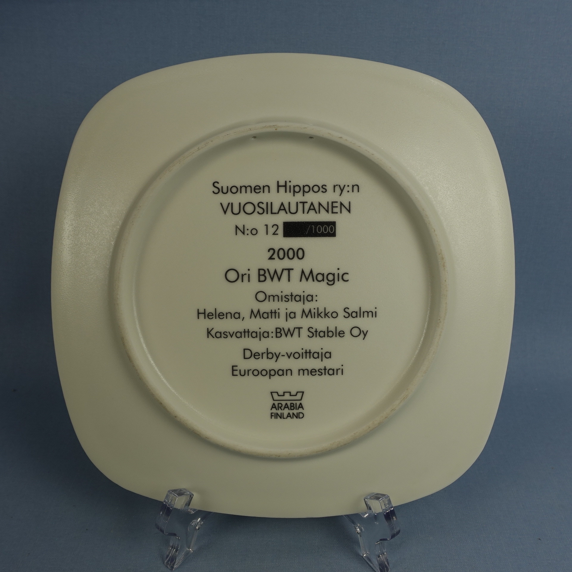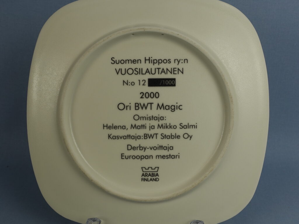 Annual plate No. 12 of Suomen Hippos ry, Stallion BWT Magic.