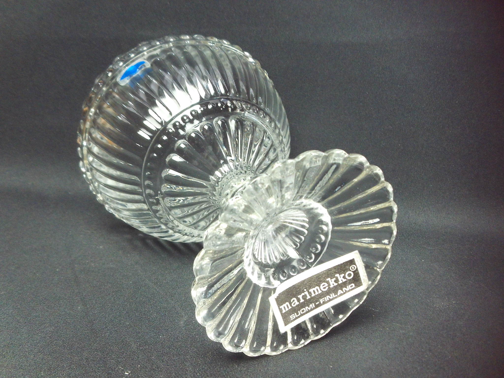 Nuutajärven lasin valmistama kirkas Mariskooli, jonka korkeus on 155 mm. Kulho on 1970/-80-luvun tuotantoa. Kulhon pohjassa ei ole Marimekko-stanssia eikä muottinumeroa. Yhdessä sininen Arabia Finland-tarra sekä silkkitarran ”jäänteet”. Myynnissä olevat skoolit ovat ehjiä ja muutenkin hyväkuntoisia.